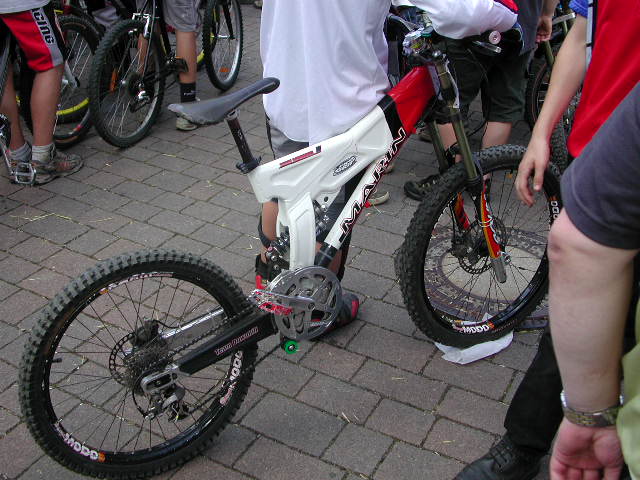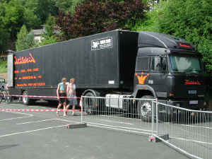 Die Schwinge stützt sich über eine Druckstange an einem Hebel ab . Die Länge dieser Druckstange ist veränderbar , wodurch sich der Lenk und der Sitzwinkel anpassen lassen. Der Hebel der die Bewegung der Schwinge an den Dämpfer weitergibt besitzt zwei Aufnahmebohrungen für die Druckstange , über die der Federweg verändert werden kann. Obs auch gut funktioniert kann ich leider nicht sagen, weil ichs nicht gefahren bin. (der Bierstand hat gerufen!!!). Auch die Jungs von Zonenschein haben nicht gerade auf der faulen Haut gelegen und einen fetten Teamtruck auf die Räder gestellt mit dem sie in Rittershausen aufkreuzten. Außerdem kann man ihre beiden Räder meiner Meinung nach als sehr gelungen bezeichnen. Der Downhiller Archimedes DH-1 besitzt 220 mm Federweg, ein ultrafettes Sitzrohr, eine Verstellmöglichkeit für den Radstand und vieles mehr... . Kinematisch gesehen ist das Zonenschein ein Eingelenker . Das Federbein wird jedoch nicht direkt von der Schwinge sondern durch eine Hebelumlenkung angelenkt die sich unter der eigentlichen Schwinge befindet. Das ganze wird garniert von einer wirklich schönen Teamlackierung. Na ja ihr habt ja selbst Augen im Kopf . Schaut euch einfach die Bilder an . Des weiteren hat Zonenschein noch ein Dual Hardtail im Programm. Genaue Infos zu den Zonenschein Bikes findet ihr unter www.zonenschein.de . Der Zonenschein Teamtruck setzt neue Maßstäbe in der deutschen Downhill-Szene. Ausgestattet mit Betten, Sitzecke und einer kompletten Werkstatt ist das Zonenschein Team für alle Rennen gut gerüstet. Des weiteren gabs noch ein selbstgebasteltes Alu Downhillrad zusehen.Könnte auch sein dass es aus Edelstahl ist, Stijn meinte das zumindest. Macht einen ziemlich brachialen Eindruck. Im vorbeifahren klingt es aber eher wie im Wind flatternde Alufolie. Auch dass meiner Meinung nach superschöne Be One Downhillgeschoß gab es zu bewundern. Vor allem die Proportionen stimmen an diesem Radl, was man von dem Karpiel Armageddon nicht behaupten konnte. Die eigentlich recht stämmige MX 6 wirkte im Steuerrohr des Karpiels irgendwie verloren. |